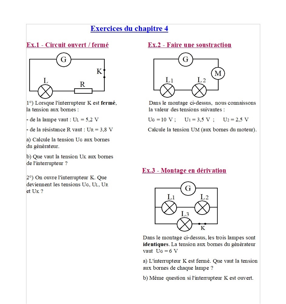 1°) a) La tension aux bornes du générateur est égale à la somme des tensions aux bornes des récepteurs,