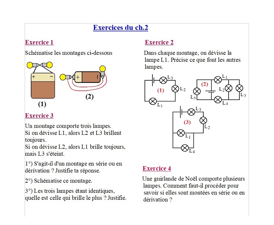 1°) Il s'agit d'un montage en dérivation, car L2 et L3 restent allumées quand on dévisse L1.