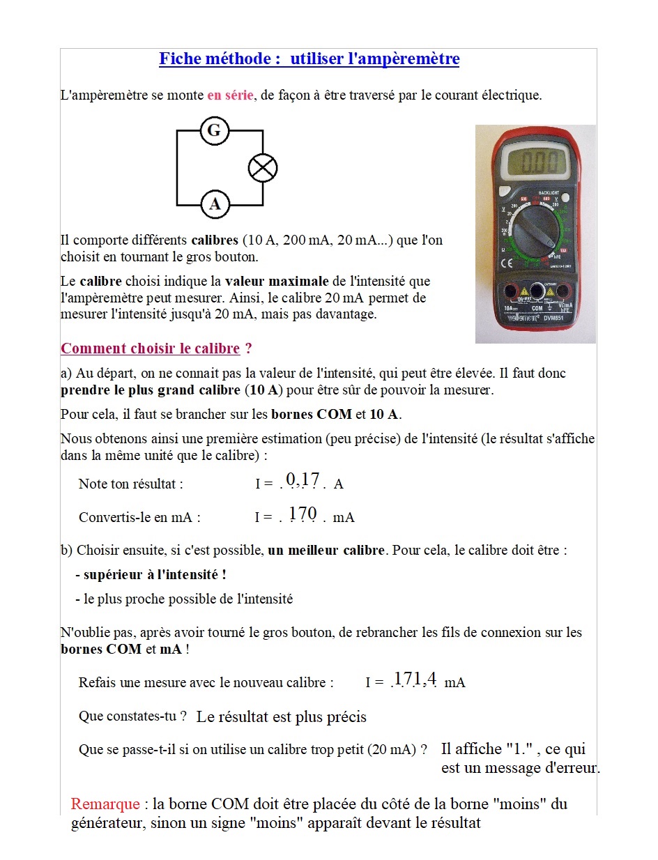 Par exemple, si l'on se place sur la calibre 20 mA, on peut mesurer l'intensité jusqu'à 20 mA. Si l'intensité